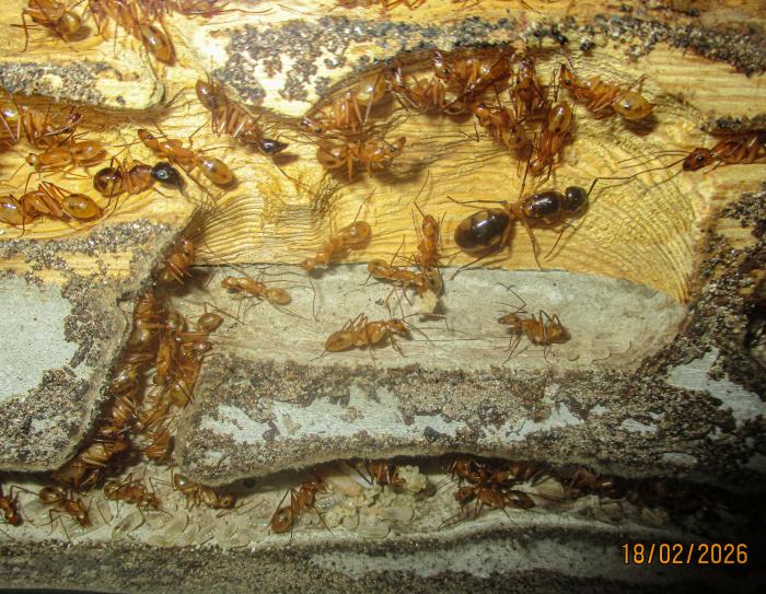 У Camponotus maculatus, исчезла матка. Ее отсутствие обнаружил 15.10.24. Семья громадная, сотни особей в 3-х гнездах. Главный формикарий пришлось отсоединять от путепроводов из шлангов и осматривать с фонариков со всех 4-х сторон. Два других, гипсовых, тоже подверглись тщательному осмотру- безрезультатно. Семья была обречена на постепенное вымирание. Обычно семья еще успевает вырастить самцов из неоплодотворенных яиц, отложенных рабочими.