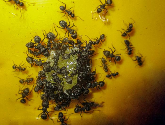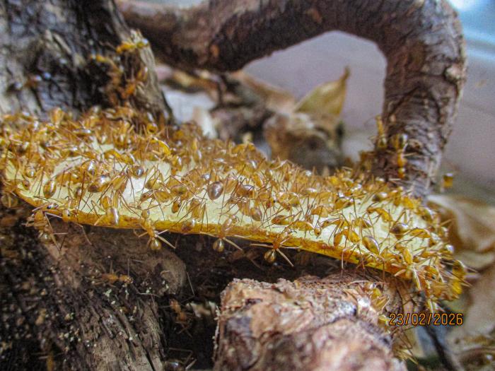 Camponotus maculatus с удовольствием потребляют углеводы в виде мандарина и груши. Передают пищу по цепочке-трофаллаксис. От фруктов остаются тонкие сухие пленочки.