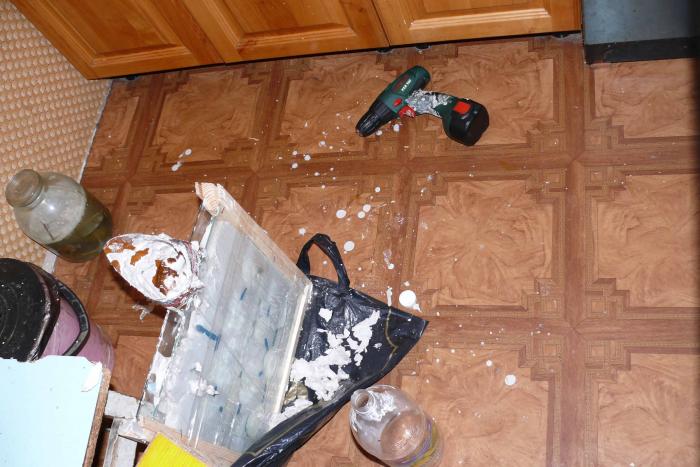 Исправил дефекты формика, не замарачивался над ходами, поэтому весь процес от решения начать...и... до "фух наконецто убрал", заняло не более полутора часа, опять таки не угадал пропорцию воды и гипса...