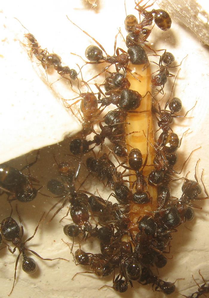 Давно не писал об этой колонии. Пришло время отписать). Структоры перешли в очередное новое жилище, фотки которого можно увидеть здесь. В семье более 1000 рабочих, считать я не отважился). Немножко фото охоты: Наконец то завалили и запихали): А потом завалили вход: Один из входов: Матка со свитой: Кормовая личинка: