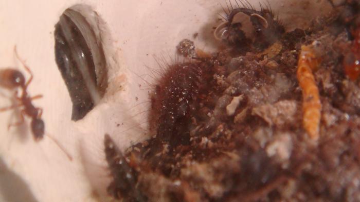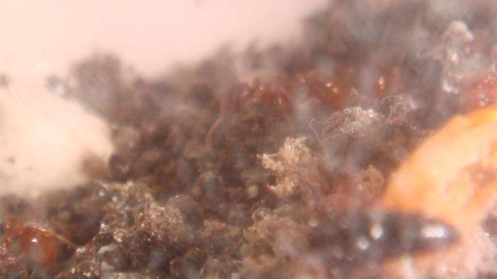 Дело было вечером делать было нечего , значит сжу я себе занимаюсь делами и решыл посмотреть на своих мирмик , смотрю себе смотрю , и бац чтото непонятное светло рыжее пробежало по куколке матке!! Я сначала подумал что просто спать хочется и глючит под ночь меня))) но через нескольк чекунд ещёра пробижало перед стеклом, и главное шустро бегавли, я давай смотреть, смотрю себе смотрю и ещё меньшее создание белого цвета по гипсу ползёт(не быстро) и бац снова рыженький пробегает , а я не долго думая зашол на сайт антклуба и давай паниковать))