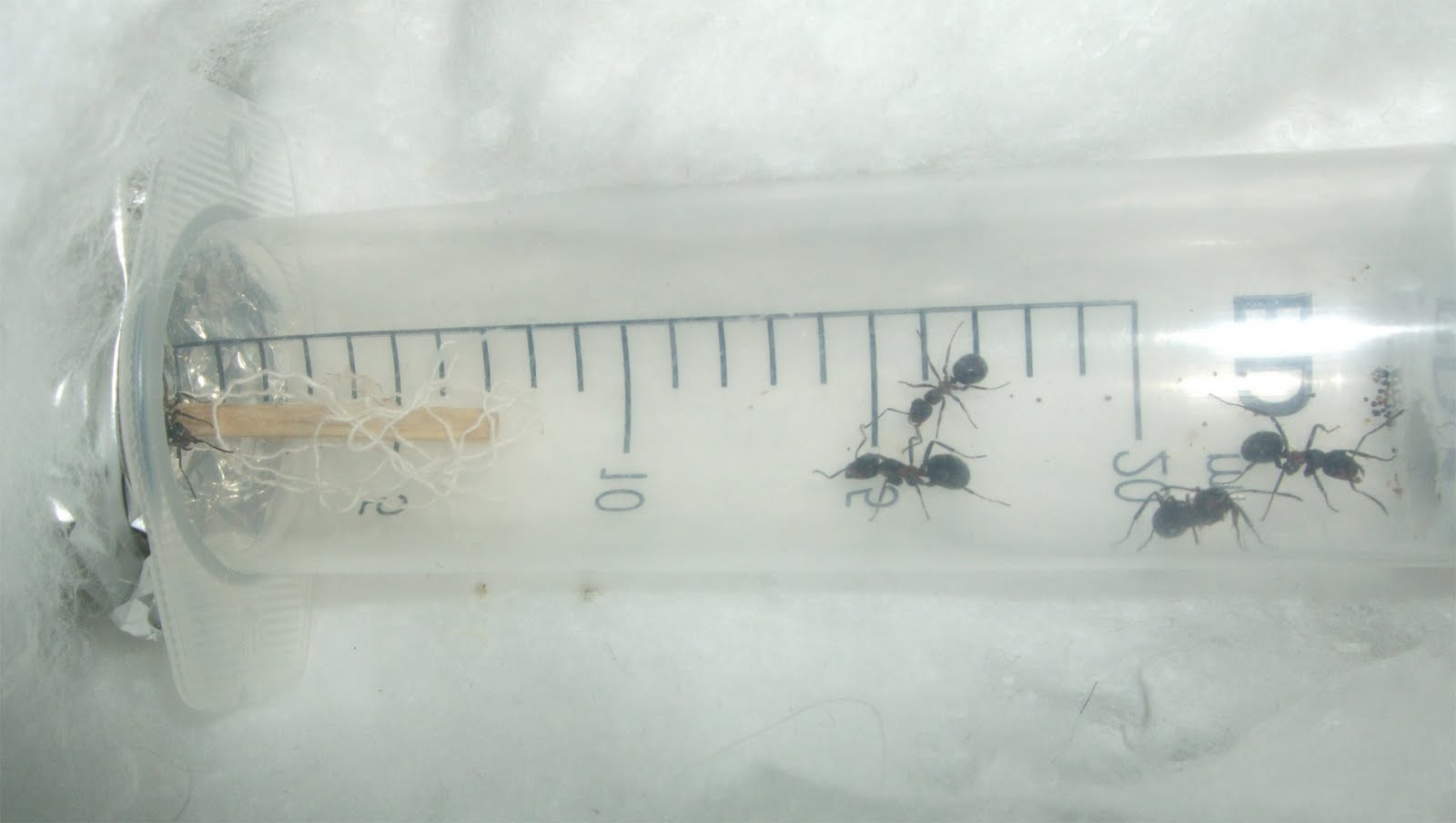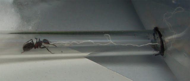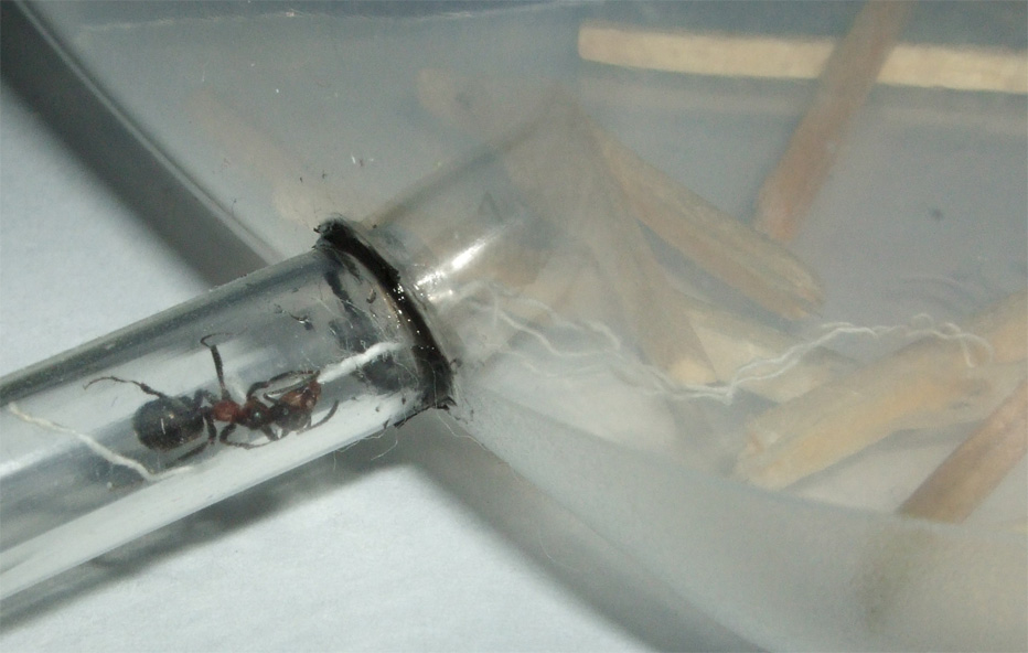 Решил попробовать осуществить подселение группы описанной в Изыскательстве. Адаптер сделал простой, для этого взял кусочек трубки, с одной стороны заткнул его ваткой, во внутрь положил комочек смоченной ваты и подсадил муравья (взял из группы одного из самых мелких). Вход "забинтовал", для этого сложил бинт 4 раза и получил небольшую сетку: и муравей не вылезет и в то же время пообщаться смогут. Этот адаптер и положил на арену где периодически нарезал круги разведчик.
