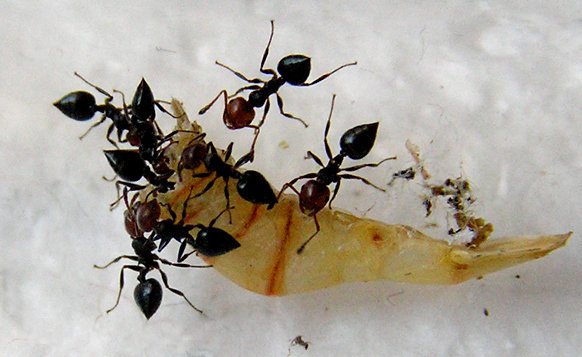 Непривередлив, всеяден. В качестве углеводов – раствор меда или сахара, кусочки фруктов. В качестве белковых кормов подойдут любые кормовые насекомые, будь то таракан или сверчок. Насекомых разгрызают на мелкие кусочки и хранят в самых сухих камерах формикария. На таких запасах семья может жить без ущерба долгое время, что очень удобно, если надо оставить ее без присмотра.