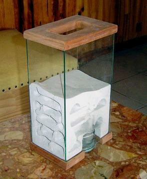 - Влажность. Начнем с этой проблемы. Как многим из вас известно, муравьиные личинки и яйца очень требовательны к влажности воздуха (90-95%). Поэтому неважно насколько хорош или плох сделанный формикарий. При недостатке влажности в нем погибнет весь расплод, а впоследствии не будет условий для появления нового. Через время начнут погибать рабочие, а потом и более крупные муравьи – солдаты (если таковые в семье имеются). Так вымрет вся колония. Чтобы этого не произошло, необходимо продумать эффективную систему увлажнения наполнителя формикария. Плюс к этому надо пресечь быстрое испарение влаги. При нормальной для муравьев температуре небольшой гипсовый горизонтальный формикарий может высохнуть за день. Чтобы этого не случилось, его края покрывают нитроэмалью, либо помещают гипсовую плиту в стеклянный бокс, вырезанный по размерам формикария.