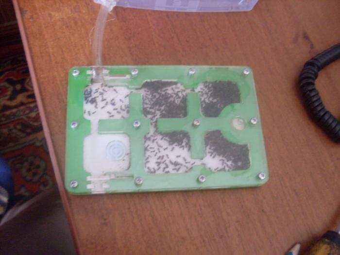 Прошло 2 года в колонии уже боле двух лет после поимки матки Lasius niger. Колония набрала рост уже + - 400 рабочих. Формикарий акриловой, заселил нигеров 23.08.2016. Появилось много разплода, очень, думаю формика хватит на месяц-два. Варианта 2 переселять в формик побольше или подключить вторую секцию. Так же в фомке появилась большая куча непонятно чего. Муравьи постоянно на ней сидят и каждой раз после кормления куча растет и постепенно исчезает. Так что буду следить за этой колонией и докладывать вам).