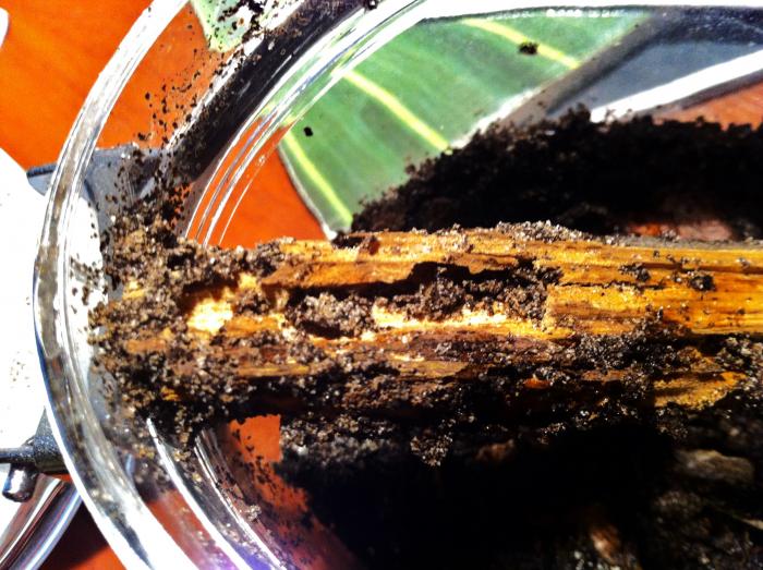 Термиты живут себе припеваючи, едят древесину, сами живут в палке, которую почти съели изнутри, яйца и личинки все находятся в коре. когда я провожу манипуляции с аквариумом, то в земляные ходы выбегают солдаты и рабочие, которые начинают бить головой об пол (озвучивая тревогу). Едят очень много, оставляя от древесины лишь верхний слой.