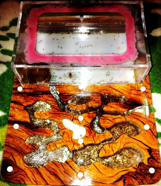 Сейчас переселил мурашей в более красивый и компактный формикарий, мне и мурашкам он очень понравился, по- прежнему не хотят делать отводки в пробирках, живут в формикарии, пьют сироп и едят белок. Сейчас народилась куча самок и самцов, все весело гоняются друг за другом, что сказать, весна на дворе))