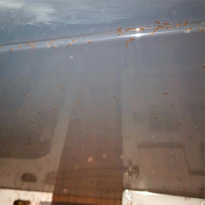 А у моих примерно месяца 1,5 назад был грандиозный побег. Незадолго до этого я повредила ногу и еле передвигалась с костылями, вследствие чего всё живое в квартире пребывало в крайне недосмотренном состоянии. Фараоны воспользовались тем, что антипобег давно не обновлялся и ломанулись за пределы арены в поисках лучшей жизни. К счастью, я обнаружила эту катастрофу в ближайшие часы. Шкаф, в котором стоял формикарий, кишел муравьями. Шкаф большой, с антресолью, а в нём чего только нет: одежда. книги, тетради, документы, коробки с игрушками, - в общем, просто райское место для основания новой колонии. Первым делом я восстановила антипобег. Потом очистила от фараонов стоявшие рядом формикарии (какое счастье, что все входы в камеры увлажнения были закрыты!) и перенесла их в другую комнату. Ну и потом пылесосом для клавиатуры стала собирать беглецов. Больше ничем бы не получилось. Думаю, сбежавших было несколько тысяч. В первый день все они перемещались хаотично, но в последующие дни остатки беглецов стали действовать организованно. Ловить такую мелкоту, да ещё в таких кол-вах нереально. Поэтому все муравьи, не попавшие в пылесос, уничтожались. Фараоны явно понимали, что происходит что-то неладное и постоянно меняли маршруты передвижения. По большей части они стали ходить под потолком и постоянно меняли тропки к аквариуму. Ни одной матки или рабочего с расплодом не видела, поэтому надеюсь, что хим. обработку квартиры делать не придётся.