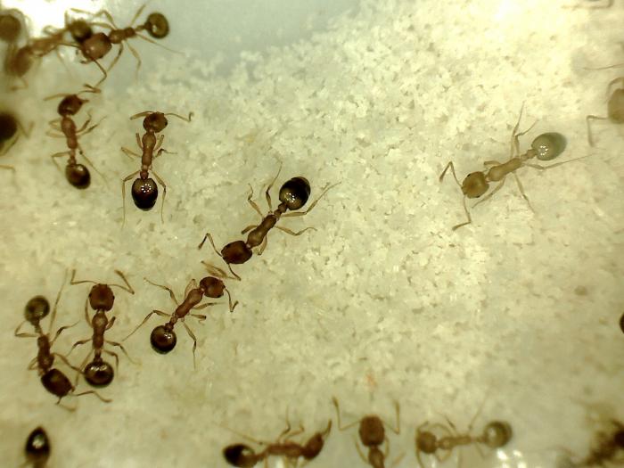Всем привет, хочу начать с того, что меня всегда поражали муравьи, живущие мега колониями с несколькими матками, еще интереснее, если эти муравьи размножаются отводками и имеют несколько гнезд, такими муравьями являются монориум фараонис. И вот, колонию этих муравьев я и получил от Ольги (olga71) , за что ей огромное спасибо)) (ссылка на начало колонии http://www.antclub.org/node/9458). У неё они жили в круглом формикарии, который разгерметезировался и надо было срочно переселять их в другой. Я еще давно подготовил для данного вида формикарий, подаренный мне в Ант планет, он больше всего, как мне кажется, подходит для этих малюток. Через два дня я стал их переселять, до этого они стояли у меня в тазе с водой, и муравьи из-за этого беспокоились. Переселение прошло без потерь, я разломал старый формикарий и кисточкой смел всех на арену нового, фараоны сразу сложили весь расплод и маток, всего их 23, по углам, а сами стали лихорадочно искать место для нового дома. И вот разведчики наткнулись на новое жильё. Была отправлена экспедиция в новый формикарий, и через несколько минут в трубку лился поток муравьев, с расплодом и матками. Зрелище было не хуже, чем бегущая орава бродячих муравьев)). Заселившись, муравьи накинулись на еду, съели весь белок, из углеводов я положил мед, его у меня едят все муравьи, но его закидали мусором. Через 4 дня я поставил им крышку с сиропом, и из формикария хлынула рыжая волна страждущих и жаждущих, все наелись и напились. Сейчас фараоны отдыхают и постоянно откладывают яйца, поэтому скоро у меня будет мега колония.