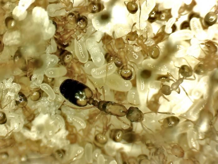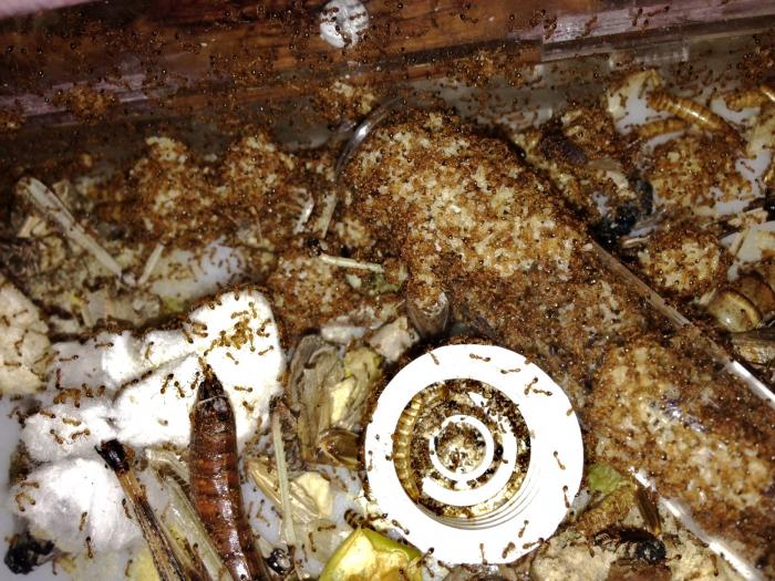 Уже давно наблюдаю за расположением расплода у фараонов и они его сортируют. Крупные наевшиеся личинки всегда лежат в отдельности от всего расплода по одной. Яйца, мелкие личинки, предкуколки и куколки все лежат в одной куче, скрепленные в "гору". И отдельное место занимают питающиеся личинки, они лежат у сухой еды, которую разжевывают рабочие и кладут им в рот.