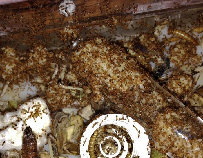 А мои фараоны вопреки бытующему мнению на живых тараканчиков набрасывались похлеще феидолей, и через пару минут бедняга уже был полностью облеплен жаждущими белка муравьями.