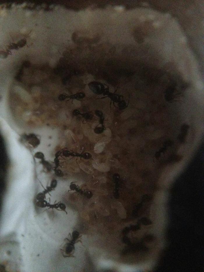 И вот спустя 3 месяца, после поимки в начале июля матки начали очень активно нестись и за эту неделю вылупилось с десяток рабочих. У них наблюдается очень хороший аппетит, полностью вычищают изнутри мошку или тараканье бедро. У этих мелких личинок мало, что можно разглядеть, но рабочие всегда тащат белок к личинкам. Поэтому я подозреваю, что их личинки, как и у катаглафисов очень подвижны и способны питаться самостоятельно.