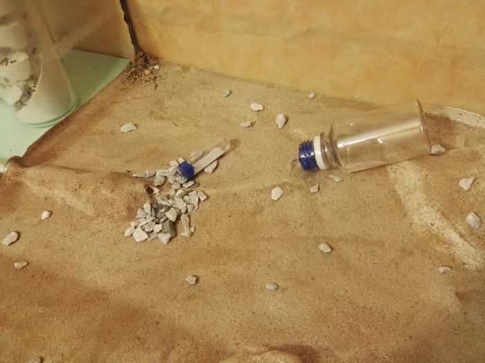 По началу выход из трубочки, сразу же был наглухо затаскан камушками с арены(видно на фото), потом вроде освоились и растащили их от входа в трубочку)