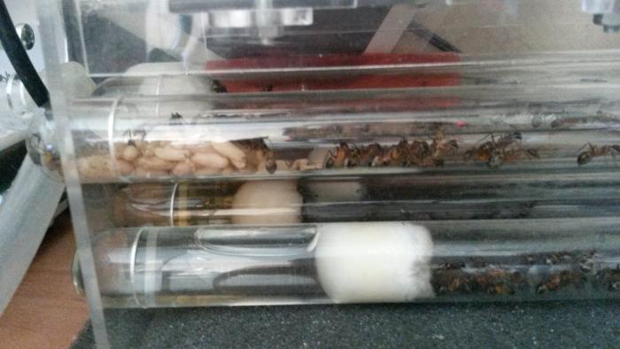 Кормить стало все труднее, атаки на пинцет все активнее и многочисленнее, на арене постоянно тусят 20+ рабочих- было решено переселять в формикарий. Долго думала в какой именно, решила пока в пробирочный- у него большая арена и деление гнезд присутствует.