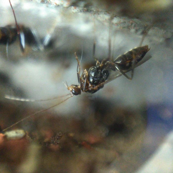 Одной важной особенностью самок этого муравья является то, что на ранней стадии развития семьи они не «закупориваются», полагаясь только на собственные ресурсы, а продолжают время от времени покидать гнездо, чтобы подкрепиться снаружи. Из этого можно сделать вывод, что стоит с самого начала обеспечить самке регулярное свежее питание. В ином случае, когда (и если) появится первая личинка, на ее прокорм могут пойти остальные снесенные яйца. В моём случае, самка охотнее всего поедала дрозофил и мелких – 3-6 мм сверчков, при этом впадая в панику от насекомых большего размера. Резанных крупных насекомых – туркменского таракана, мучного червя и куколку – она не ела, шарахалась и в ужасе щелкала челюстями. Предлагал я ей также на пробу: мелких мокриц, личинок из полынного стебля, мелких бегающих личинок каких-то неизвестных мне почвенных жучков из лесного опада, ногохвостку – всё это без особого результата.