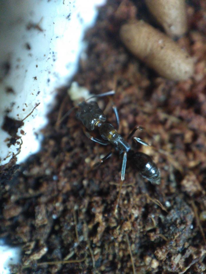 Будучи из пробирки переселена в формик, она долго сидела в силиконовой трубке усами в сторону камеры формика, и даже забаррикадировалась мелкой галькой. Однако после того, как я несколько дней подряд периодически беспокоил её задуваниями в трубку "с тылу", сориентировалась на местности успешно.