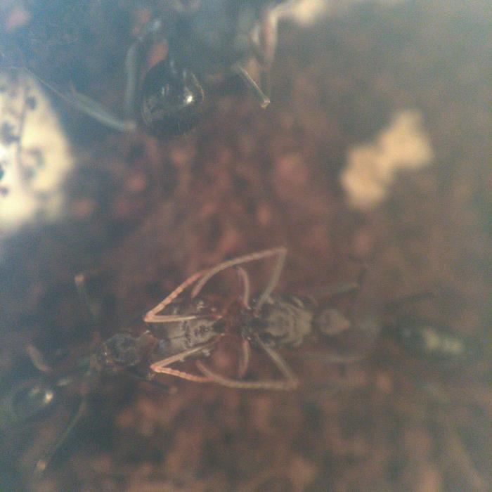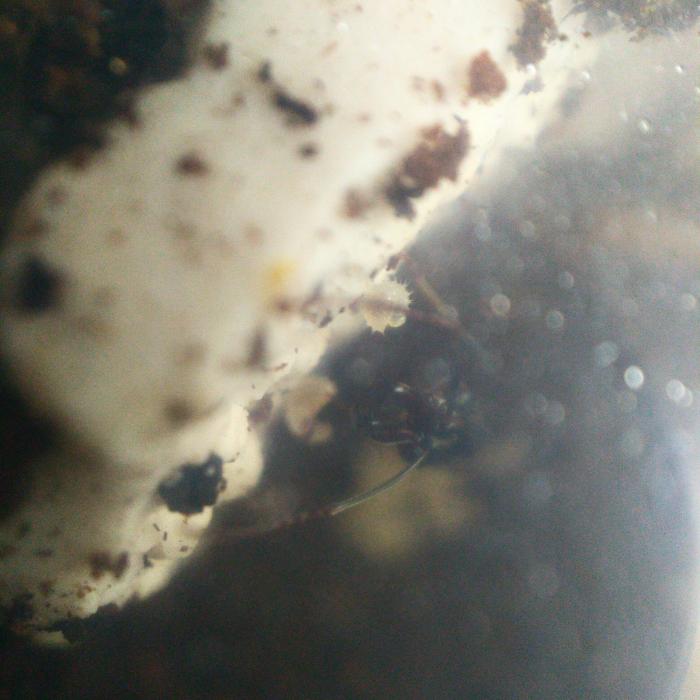 Итак, на фоне колонии Ивана́ показывать особо нечего. Но, тем не менее, процесс идёт. На настоящий момент в довесок к матке имеется 8 мурашей, они наконец-то начали выползать на арену - понатаскали в формик обрывков сфагнума.