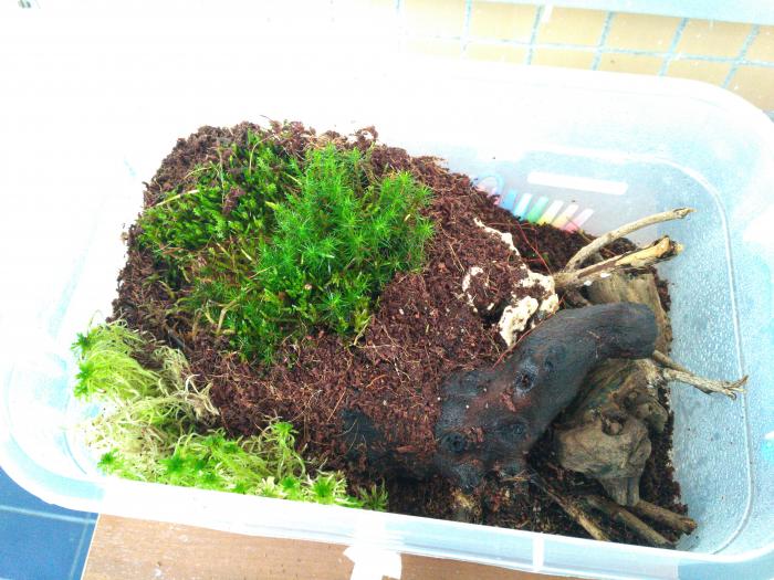 А вот у Крузо последовало переселение в новый мини-формик из пластикового контейнера с кокогрунтом. Причина - при моих 10% влажности (спасибо, центральное отопление!) комбинированный вариант формикария с ареной (гипс) очень непредсказуемо высыхал.