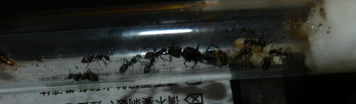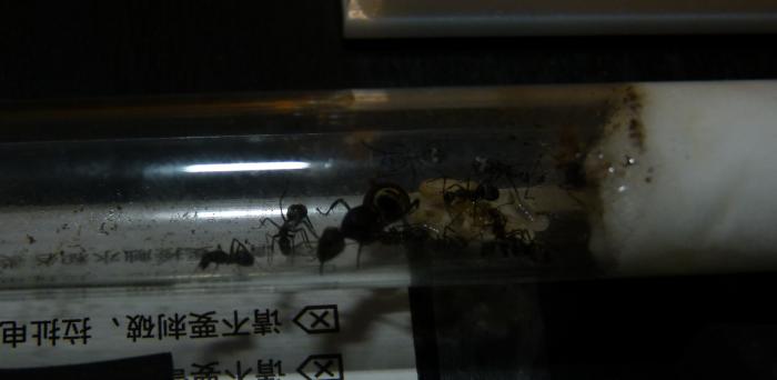 После трапезы все благополучно ушли в пробирку и я наконец смог сделать подсчет. В итоге: 12 рабочих, 2 кокона, 9-12 личинок и ~7 яиц.