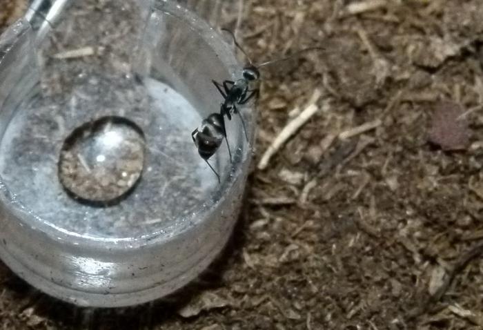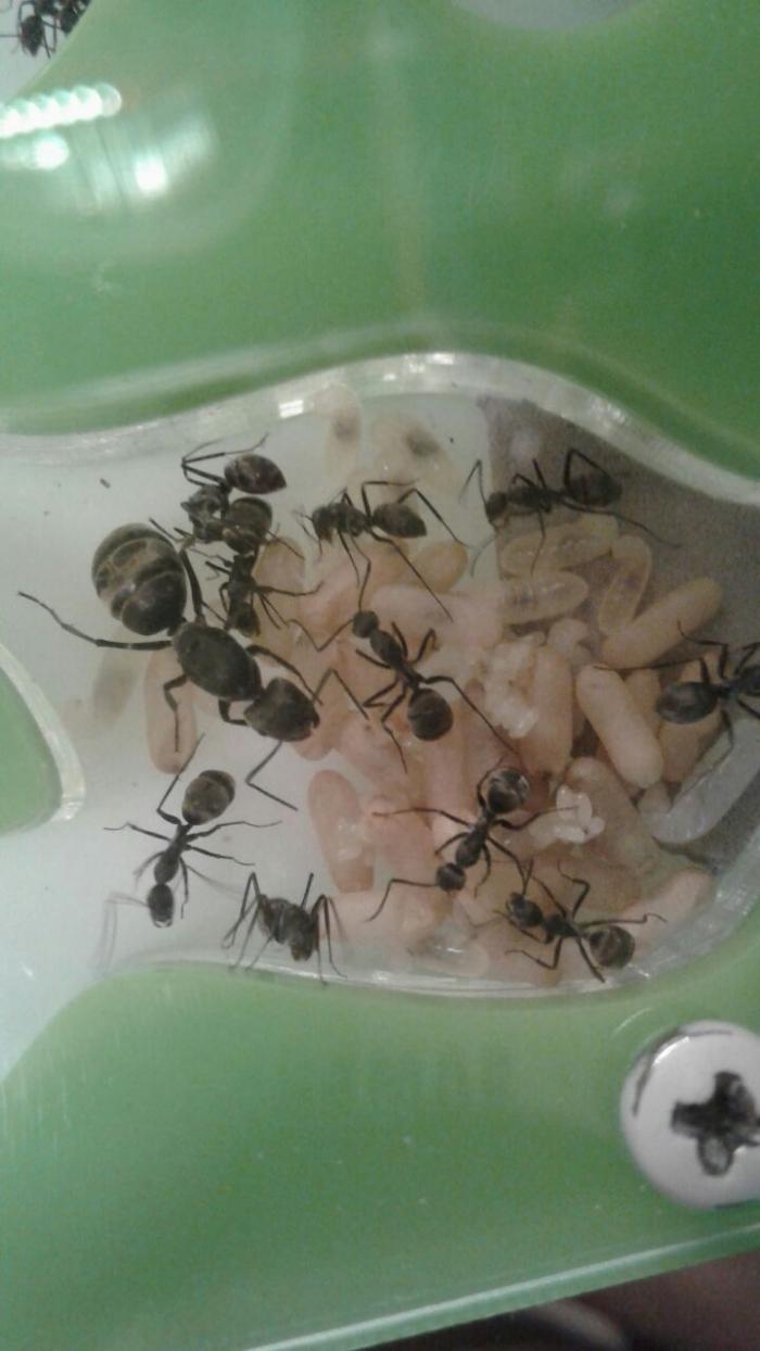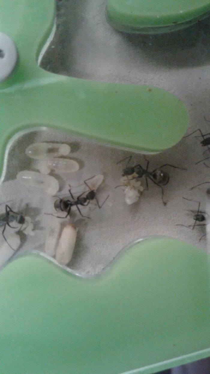 В данный момент колония очень активна. Перед моим отъездом были переселены в ант планетовский формик мини+ 12 мм. Думаю что увиличение количества расплода заслуга такого переселения. Едят все что дам. Туркмены, мокрицы, коконы мух, сверчков, знахаря и даже зоофобоса (пока все мои колонии есть зоофобоса отказываются). Из углеводов различные сиропы, фрукты и мед.
