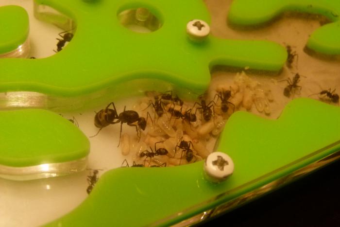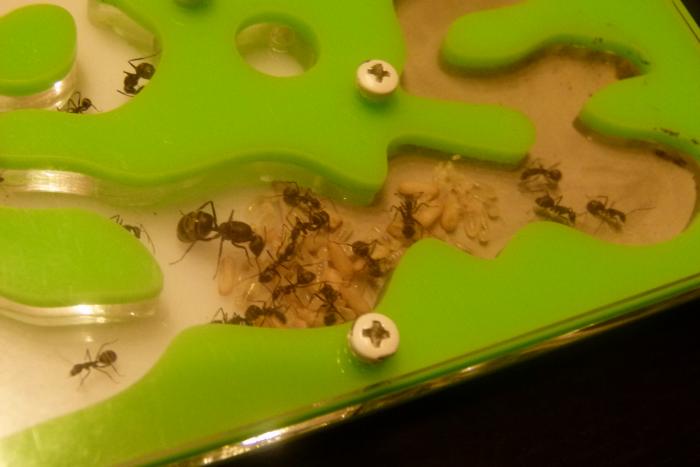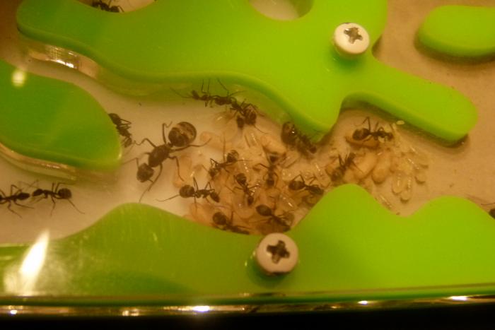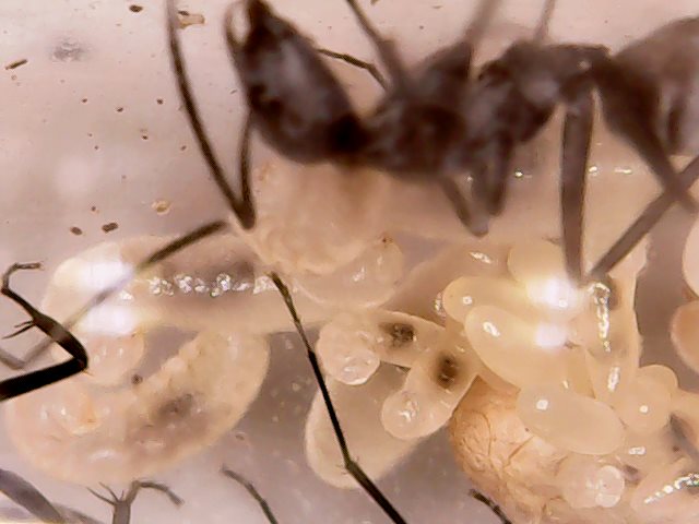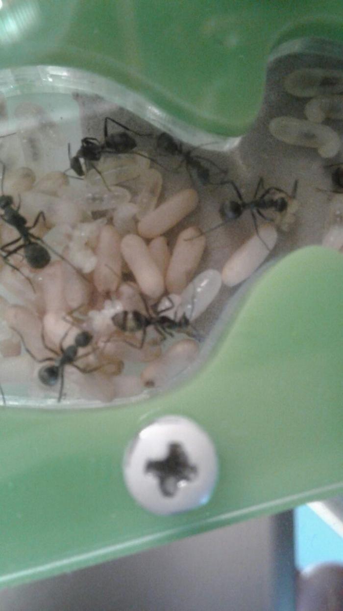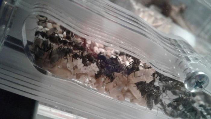 Численность выросла до 20 муравьев. Королева в день исправно дает 2-3 яйца. Коконы, личинки и тд. Кормил неделю их мухами из крашенного опарыша, и сегодня обнаружил то что яйца тоже стали розовые. Однако забавно)