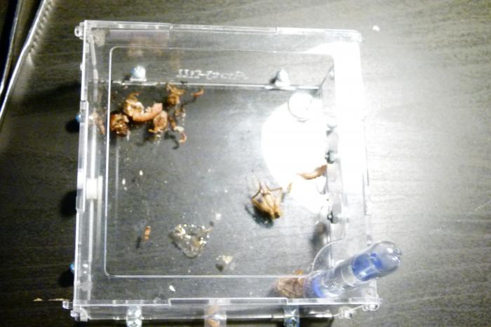 В конечном итоге я все же переселил муравьев в пробирку аккуратно прорезав дырку в контейнере и убрав влажную салфетку дабы ускорить процесс. (к сожалению фотографий данного действа делать не стал). После переселения я долго не мог отключить пробирку от контейнера из-за боевой королевы (возможно повлиял первый способ инкубирования, а может у этих муравьев такой характер) которая долго ходила по "арене". Через некоторое время подложил придавленного сверчка в надежде что королева испугается и все же уйдет в пробирку. Но каково было мое удивление когда я увидел что королева первая пошла в атаку, более того она начала разделывать добычу.