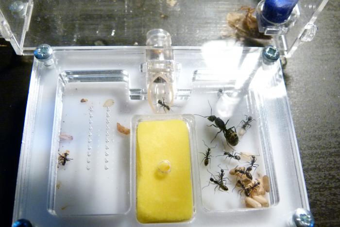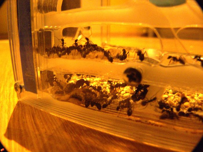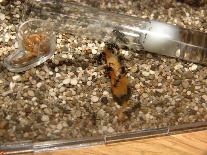 Муравьям были предложены свежие мухи и виноград, от которых уже через два часа оставалось мокрое место и кусочки хитина).