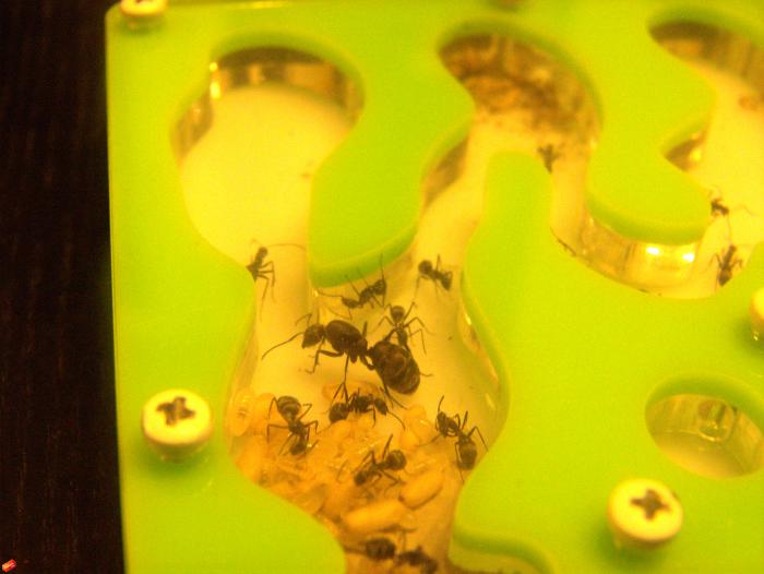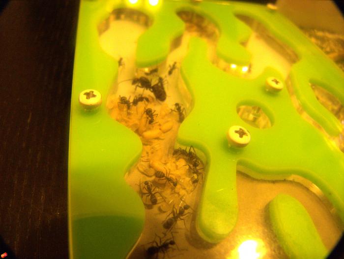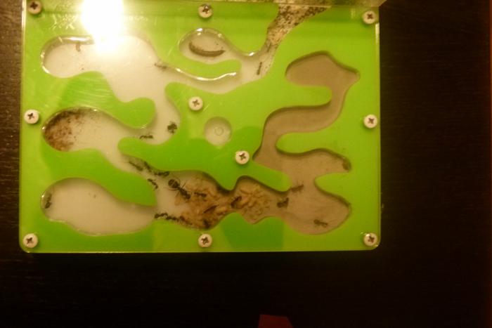 Вот уже 5 дней как я переселил муравьев в новый формикарии. Это явно пошло им на пользу, ведь за последнюю неделю активность снизилась. Матка похудела, муравьи стали отказываться от белка. По началу я решил что это их тропическая диапауза. Я продолжал кормить колонию, каждый день менял мух, фрукты, сиропы, тараканы (туркмены и мадагаскасцы) знахарь и мучник. Все это ели кране не охотно. А все что затащили в камеры тромбовали по углам. В итоге появилась плесень, которая при снижении влажности в гнезде резко погибала.