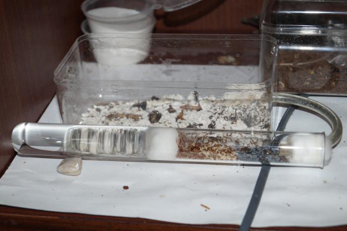 Муравьи были в малюсенькой пробирке диаметром около 5мм и длиной около 4 см. Ватка в пробирке уже подсыхала и я решил их переселить, но то ли из-за стресса, то ли из-за того что их было слишком мало (матка и 5 рабочих) муравьи переселяться отказались и просто сидели в пробирке сбившись в кучку. Прождав сутки я решил таки переселить их насильно ибо переходить сами они продолжали откровенно отказываться. Муравьи были очень пассивны и даже проигнорировали таракана. Обмозговав всю ситуацию я посадил их в "Установку автономного содержания". То есть просто затемнил инкубатор, подключил к нему пробирку с маком и кинул туда до кучи немного бразильского ореха.