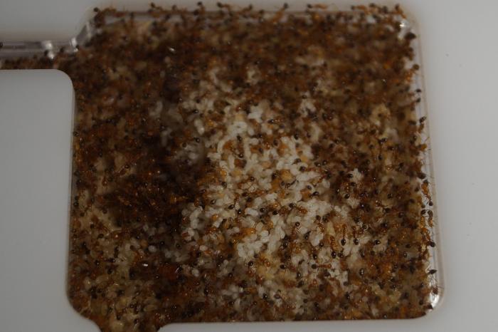 А развивается она семимильными шагами. На арену уже ходят крупные и намного более сбитые рабочие, на куче мака в пробирке сидят головастые солдаты (причём голова у них больше чем у матки), среди расплода почти не просматривается мелких личинок а есть только среднекрупные и крупные личинки полиморфных особей. Да и в пробирке уже мало что видно, ибо то что там творится теперь больше похоже на красно-белое кипящее месиво.