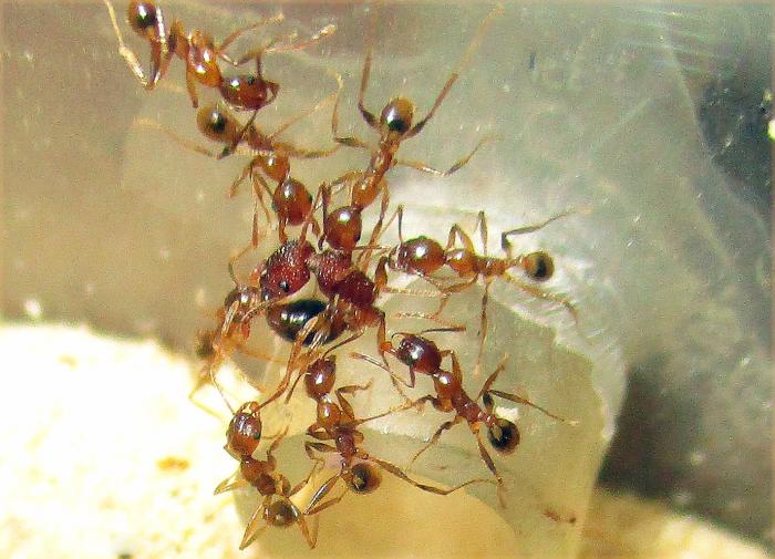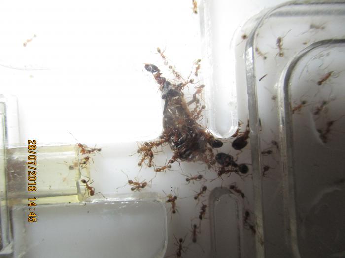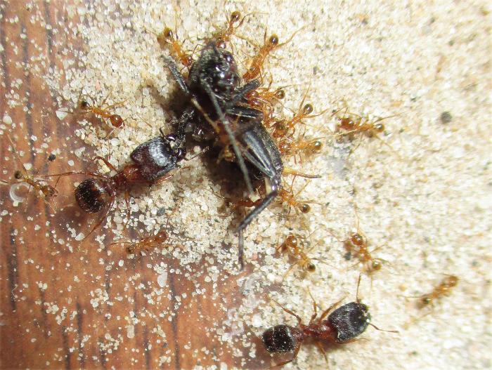 Я только недавно поняла, как феидоли охотятся на тараканов. Не люблю процесс охоты, поэтому обычно кидаю всем муравьям на арены замороженных тараканов. Но когда времени мало, а тараканы мелкие, бывает, что и так даю. Быстрее всех справляются фуски, дольше всех возятся фараонисы. А феидоли, хоть и самые мелкие, довольно оперативно обездвиживают свои жертвы и тащат в формикарий. Ну и стало мне любопытно, как же им это удаётся. Вооружилась очками с большим увеличением и лупой... увиденное было шокирующим и омерзительным: феидоли отгрызают тараканам лапы! Вцепляются и по кусочку откусывают, пока таракан не утрачивает способность перемещаться на обрубках. А потом ещё живого облепляют начинают выгрызать. Фуски и вагусы - те красиво охотятся, но охота феидолей - зрелище из разряда "слабонервным не смотреть".