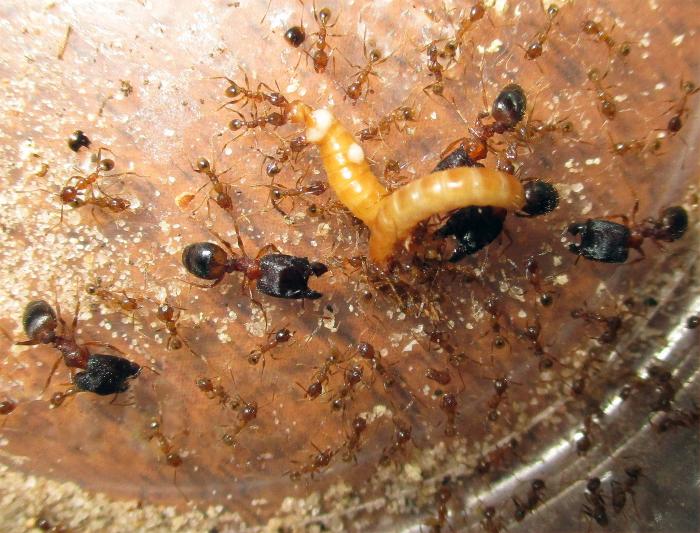 Бой Pheidole личинкой мучного хруща. Личинка неистово отбивается. Принимают участи солдаты. Рабочие буквально облепили личинку. Можно заметить отвалившиеся и вышедшие из боя группы рабочих, держащие друг-друга по несколько штук.