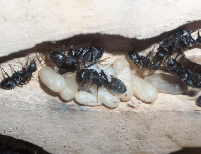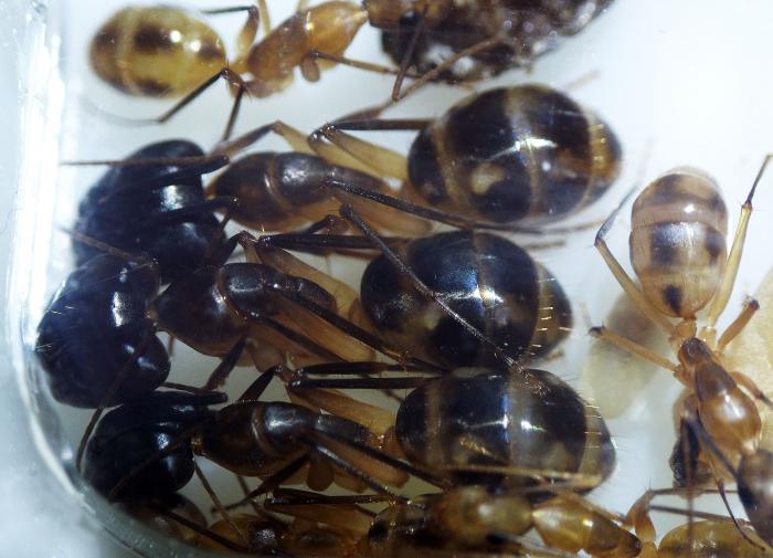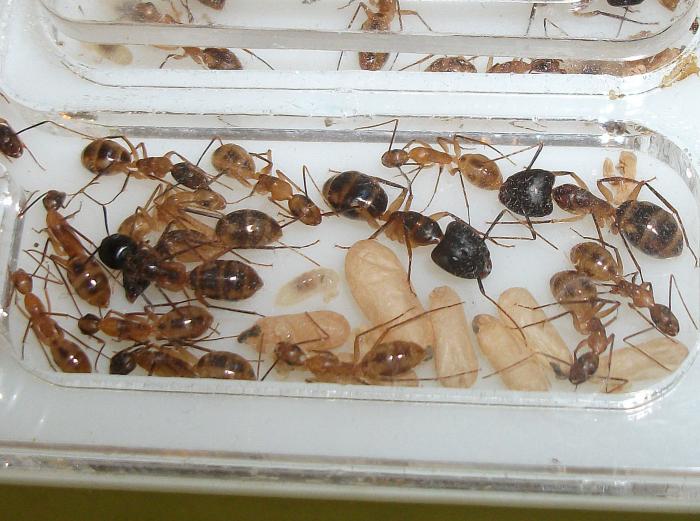 Семью Camponotus maculatus пришлось переселить в небольшой пластиковый формикарий, в пробирке заканчивалась вода. Из пробирки переехали дружно, сначала перенесли расплод, матка перешла в последнюю очередь. В семье появились крупные большеголовые солдаты.