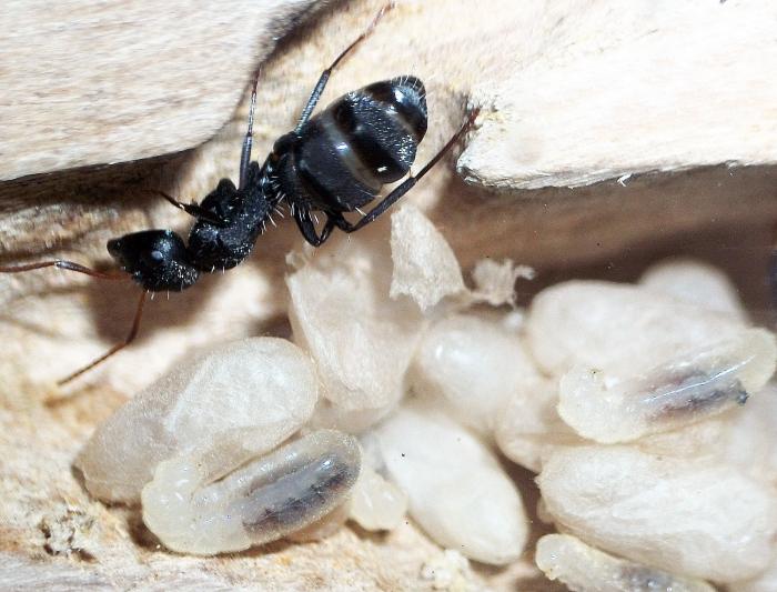 Черные сейшельские кампонотусы Camponotus grandidieri достаточно окрепли и я решил изъять у них пару куколок и передать их одинокой матке Polyrhachis illaudata. Матка их не забраковала, а сразу взяла под свою защиту. Надеюсь она не убьет вышедших рабочих кампонотусов и они ей помогут вырастить свои 3 личинки.