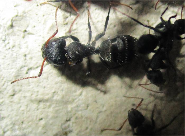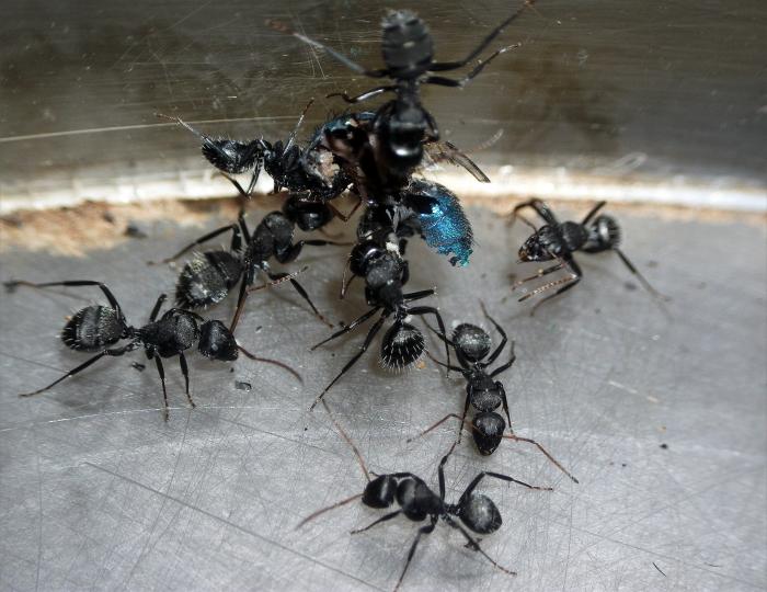 Черные красавцы Camponotus grandidieri перебрались из деревянного формикариума, который им оказался мал, в просторный гипсовый. Переселение прошло дружно, поселились в верхних камерах, подальше от камеры увлажнения, а на арене уже разделывают мух