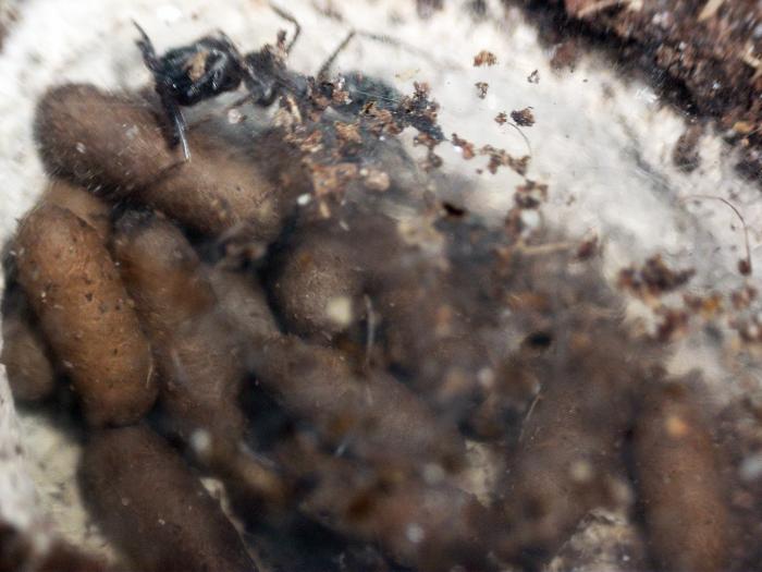 Матка Odontomachus simillimus с потомством облюбовала мой гипсовый мини-формикарий, хоть я его не увлажняю уже несколько месяцев, а под корой в кокосовом субстрате выкопан приличный муравейник. Правда может и там есть коконы или личинки. Сверчков и тараканов утаскивают туда.