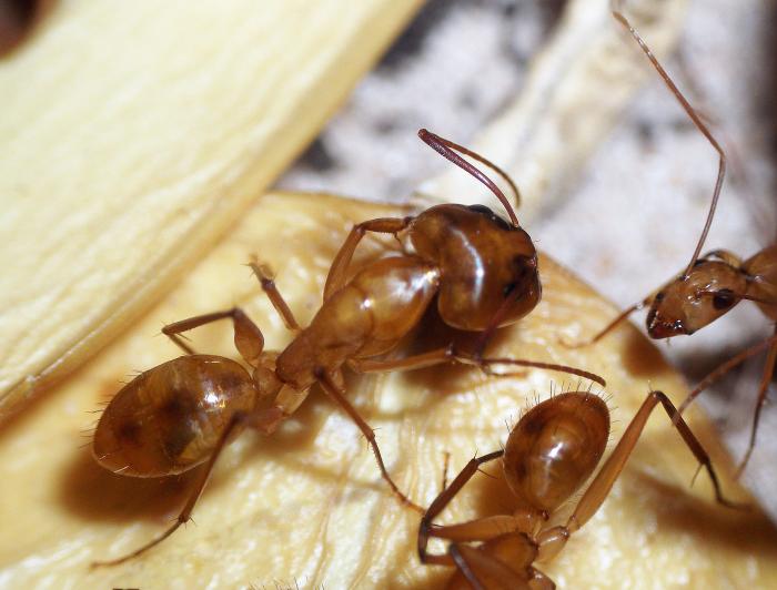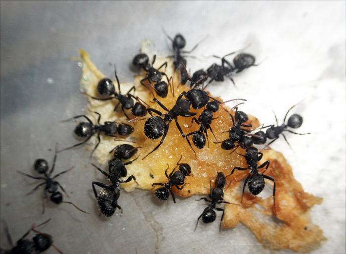 Camponotus grandidieri среднего размера кампонотусы, выглядят довольно пушистыми. Тоже любят фрукты, в данном случае поедают яблоко.