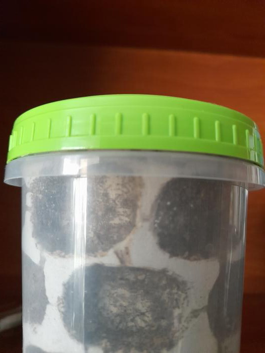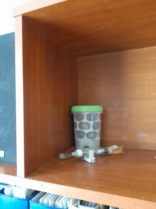 Больше всего внимание беглецов привлёк 6-литровый контейнер с кивсяками и мокрицами, стоявший на источнике бесперебойного питания. Мягкое тепло, выделяемое этим устройством, отлично подходит для подогрева живности. Поскольку ни кивсяки, ни мокрицы по стенкам не лазают, в вентиляции не было сетки, а сама вентиляция представляла собой отверстия диаметром миллиметра 3-4, т.е. вагусы проходят свободно. Крупные кивсяки вроде не пострадали, а вот мокриц, мне кажется, до 1 мая было больше... Но сильнее всего меня тревожил скорпиончик, который находился в маленьком круглом контейнере, расположенном внутри большого. Подогревать маленький контейнер, не допуская перегрева и пересыхания, сложнее, чем большой, поэтому мне казалось очень удобным греть большой контейнер, в котором стоит маленький. В завинчивающейся крышке маленького контейнера была сетка, но я часто просто клала крышку сверху, чтобы не беспокоить скорпиона. Какое счастье, что уезжая на дачу, я всё же завинтила крышку! Думаю, голодные вагусы слопали бы моего Lychas tricarinatus как простого таракана!