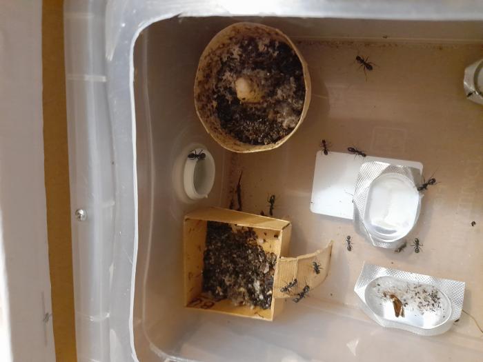 Сейчас в формикарии много расплода на разных стадиях. Матку не вижу, она снова ушла в тоннель, но тот факт, что из коконов появляются рабочие, а не крылатые самцы, свидетельствует, что она жива.