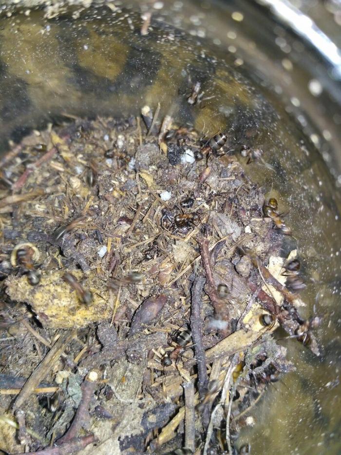 Вычитал что они полигиния и нужны рабочие для основания колониии. На месте. Без раздумий просто тупо взял рабочих (приблизительно сотню) возле муравейника и те которые тепали себе с березки,сверху вниз, ну уж с очень большими брюшками...взял немного листьев и песка тоже возле муравейника и всяких там палочек,смешал все и всех и принес домой... Короче, прошло 3 дня думаю дай загляну в банку и буду по тихом рассаживать по пробиркам и вот замечаю картину малом, 5-6 огромних куч яиц...
