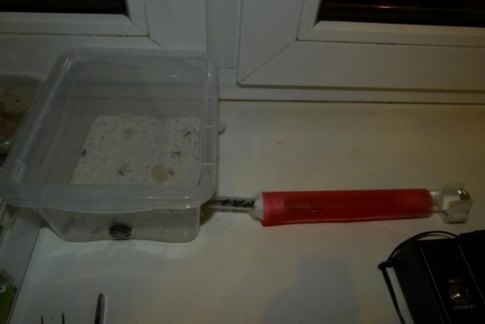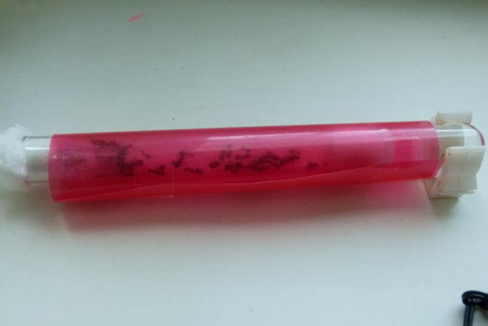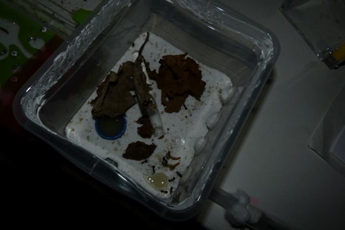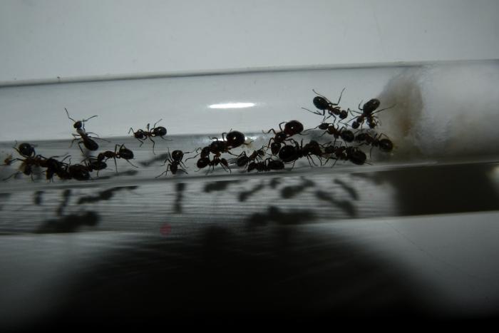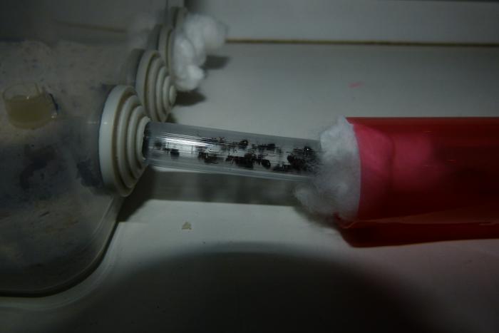 Переждав денек я подключил арену и стал знакомить сироток с новыми мамашами. Хоть они и просидели месяц без королевы, я перестраховался и подморозил мурах в морозилке (все прошло без потерь). Одновременно все муравьи были переселены в новую пробирку на 20мм. Старую засветил, новую обмотал тряпкой. Правда полным переселением это не назовешь, сидят себе в трубке, иногда ходят в сторону ватки. Но прошло всего несколько часов, так что все еще изменится.