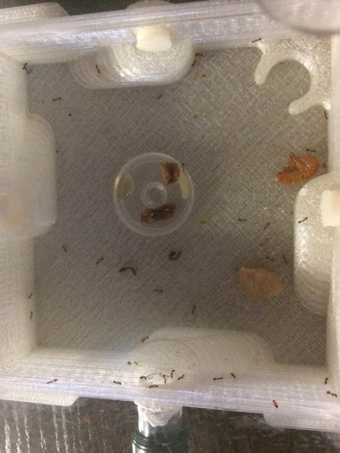 II.МОМЕНТ истины. Наконец спустя 1,5 мес. ожидания сотворения отводка и отправки, я получил их. Сразу наспех заделав все щели в формикарии (модульный из акрила), акриловым герметиком, пустил их туда. Ну и как всех начинающих мирмикиперов *борящихся* с этим видом, меня ждало разочарование, поток фараонов хлынул в щели, наспех я начал заливать пространства между пластами герметиком, но толку было мало, так просидев над ними 4 часа, все же смог заделать все щели и со спокойной душой ушел спать. Утром был сюрприз, герметик прорыт, фараоны по всему столу, благо матки не сбежали, но хозяйничали они по полной, прохаживая строем в свое новое гнездо под принтером. Начал думать как быть дальше. Выбор пал на другой формикарий, от anthill, , не полностью акриловый, основание напечатано 3д принтером. На этот раз, залил щели уже супер клеем, и о ЧУДО, формикарий их держал!...первое время... После, разобравшись в конструкции, они нашли кучу лазеек в *3д основаннии *,заливал супер клеем, но ничего не помогло,они вновь и вновь находили лазейки и расширяли пространство между прутьями модуля, пришлось его отключить...