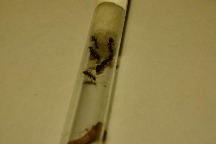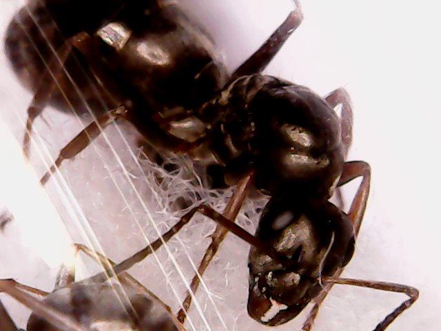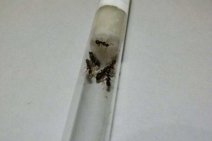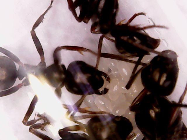 Побывав в прошлые выходные за городом, я случайно ворвался в муравейник вроде как с Фусками. Там бегало много рабочих и муравьев которые показались мне странными. Вернувшись с пробиркой я поймал двух МАТОК??? и четырех рабочих. Положив на полку проверил часов через 5 и обнаружил достаточно крупный пакет яиц!!! Был немного озадачен. Вроде матки фусок достаточно крупные по отношению к рабочим, а эти совсем крохи. Тем не менее пакет яиц растет до сих пор.