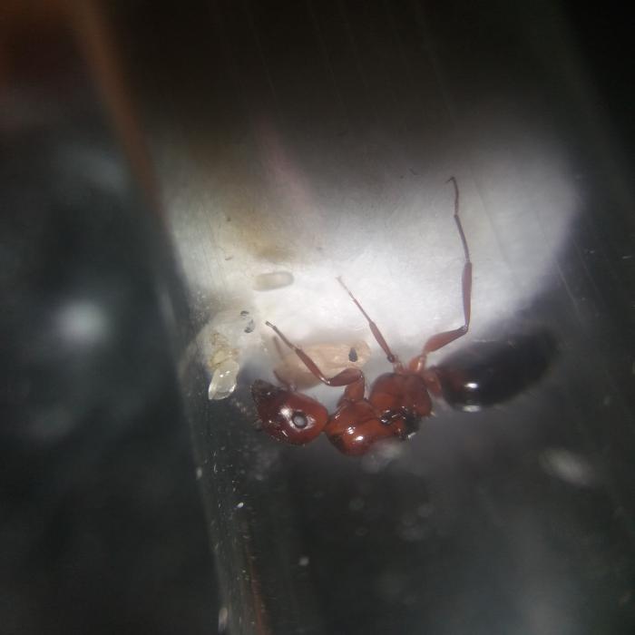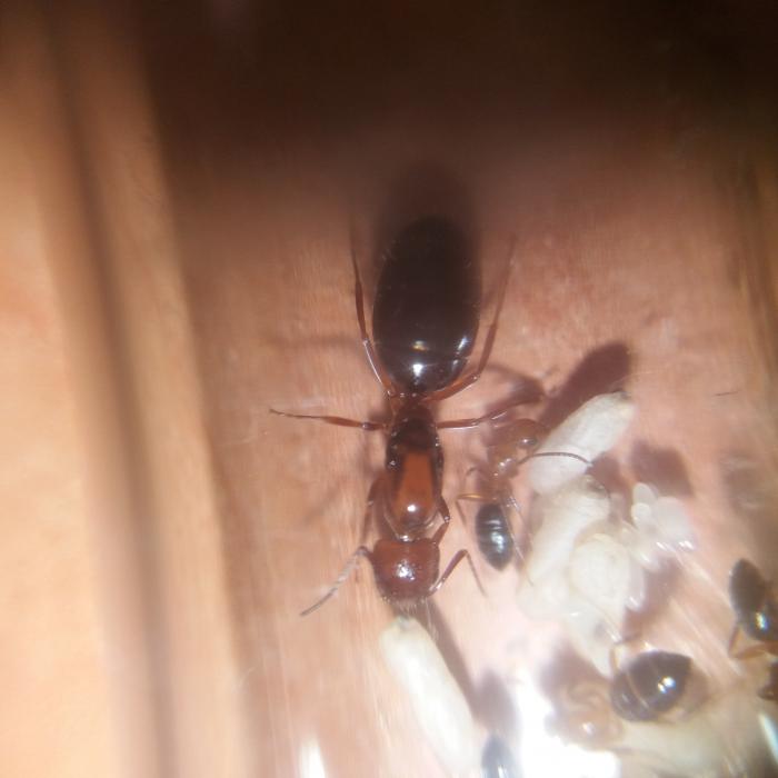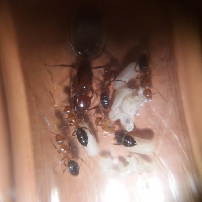 Всем привет! В этом блоге я буду рассказывать о camponotus lameerei. Появилась она у меня как подарок к посылке от казахского товарища, за что ему огромное спасибо:) Он поймал ее с крыльями, но на этот же день она их сбросила. Пришла она ко мне немного исхудавшая, но с 3 яичками, и после распаковки я её хорошечно откормил сиропом (брюшко у нее чуть-ли не в 2 раза увеличилось!), дал ей половинку мухи и положил под красную плёнку оклиматизироваться. Дальше встал вопрос - в какой пробирке её держать. Многие говорят что обычный тип пробирки ламереям не подходит, и нужно делать по другому - либо просто исключить вату и воду из пробирки (и кормить обычной водой раз в 3 дня) либо затолкать вату без воды в конец пробирки и так же кормить. Но я почему то не стал так делать. Я скрутил очень плотный тампон и вставил в воду наполовину. Затем в пробирку была пересажена матка. Я стал ее кормить раз в 3-4 дня белком и сиропчиком. И пакет яиц стал расти. И в один прекрасный день появились личинки - сейчас их 6 штук + 7 яиц. Личинки уже подходят к этапу окукливания, так что первые рабочие уже не за горами. Ну и парочка фото.