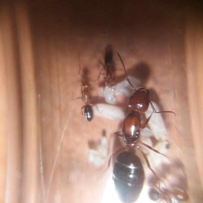 Извиняюсь за то что давно не писал. У колонии дела не ахти. В связи с неоднократными транспортировками или же по другой причине умерло всё первое поколение у моей тугайной красавицы. Осталась только матка и расплод. А так как у меня изначально было 2 матки ламереек, то я разделил расплод поровну. Обе матки вроде как следят за ним. Даже незнаю, сможет ли матка у которой умерло помощники распаковать коконы. Пока жду дальнейших действий со стороны маток. Обе иногда кладут яйца. Пробовал давать разный белок, да ничего не получилось. Матка, потерявшая рабочих, к сиропу вообще не притрагивается. А её сестрица иногда пьет. Даже незнаю что делать теперь...
