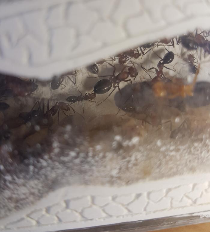 На данный момент имеем две стартовых колонии Виатикусов. Каждая матка сдружилась со своей свитой. Хотя ловил муравьёв из разных гнёзд, подселение не вызвало ни каких проблем. Новые гости, были угощенны сиропом и дрозофилами, и отправлены в более менее тихое и темное место. Для адаптации.