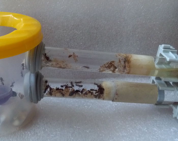 Баночка-непроливайка очень хорошо зарекомендовала себя при переселении колоний. В верхнее отверстие подключается старая пробирка, в нижнее - новая с зауживающей трубочкой (в верхней - никаких трубочек!) и затемняющим цилиндром из бумаги. Муравьи быстро понимают, что наверх ходить далеко, а жизнь там некомфортна ))) Переселила таким образом уже несколько колоний. Формики переезжали дольше всех, около недели: сразу перенесли вниз коконы, а матка и расплод ещё долго "думали".