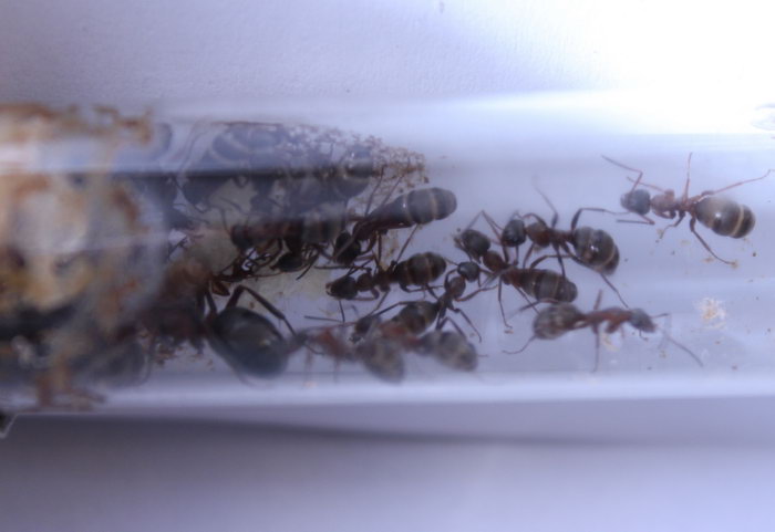 Рабочие-подкидыши очень шустрые и агрессивные. Кинула сегодня на арену десяток мелких личинок знахаря, муравьи в несколько минут с ними расправились и утащили в пробирку. Интересно, какими родные рабочие будут.