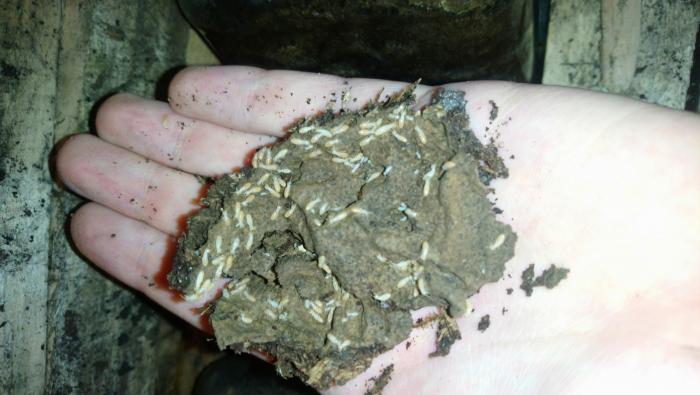 Что до нижних слоев, состоящих из старых деревяшек, которые термиты не доедают полностью, а оставляют в качестве армируюшего агента в почве, то они были похожи на губку, но термитов там было не много, им, видимо, импонирует свежая древесина. Но тем не менее, я нашел там половую особь. Самую большую из всех что я видел в колонии, длиной миллиметров 7-8, довольно толстую.
