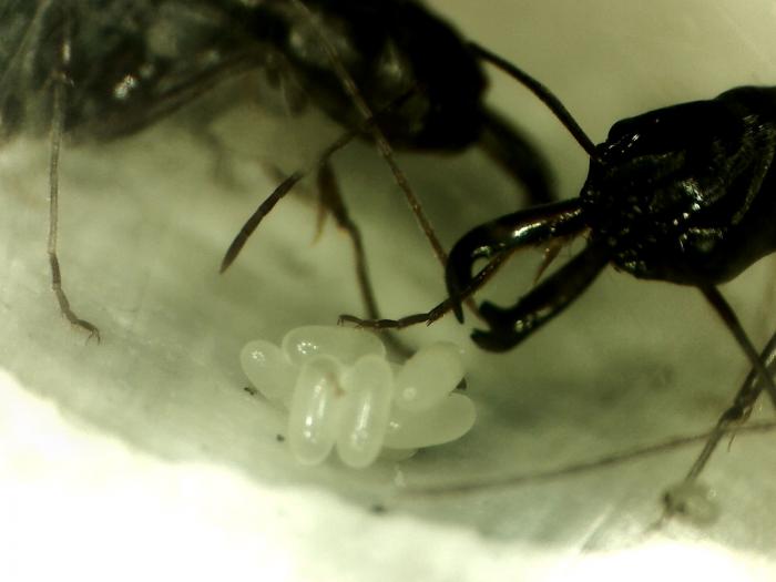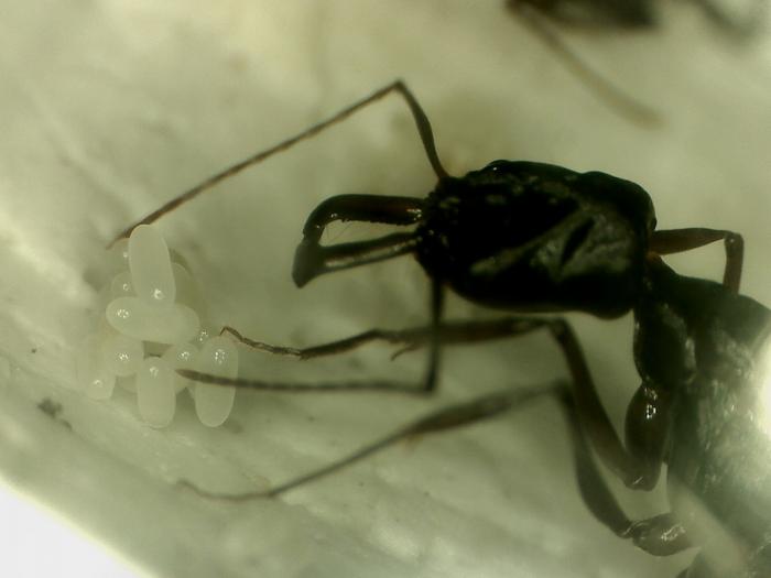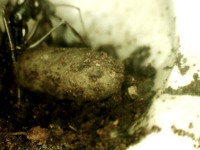 Давно не отписывался о состоянии моих капканов. Очень стабильно и быстро развиваются, едят много. И в отличие от других понероморфов, когда они сыты, брюшко раздувается до гигантских размеров, превращается в длинную колбаску. Новорожденные прозрачные муравьи кажутся хрупкими и неуверенными, но даже их заставляют держать гигантский пакет яиц, который постоянно пополняется самкой. Ну и им конечно помогают мокрички, которые охотно доедают объедки с муравьиного стола.